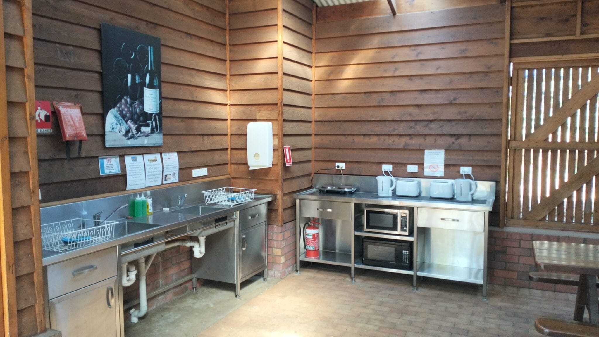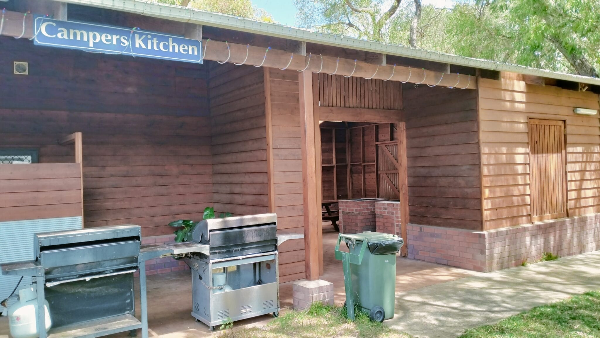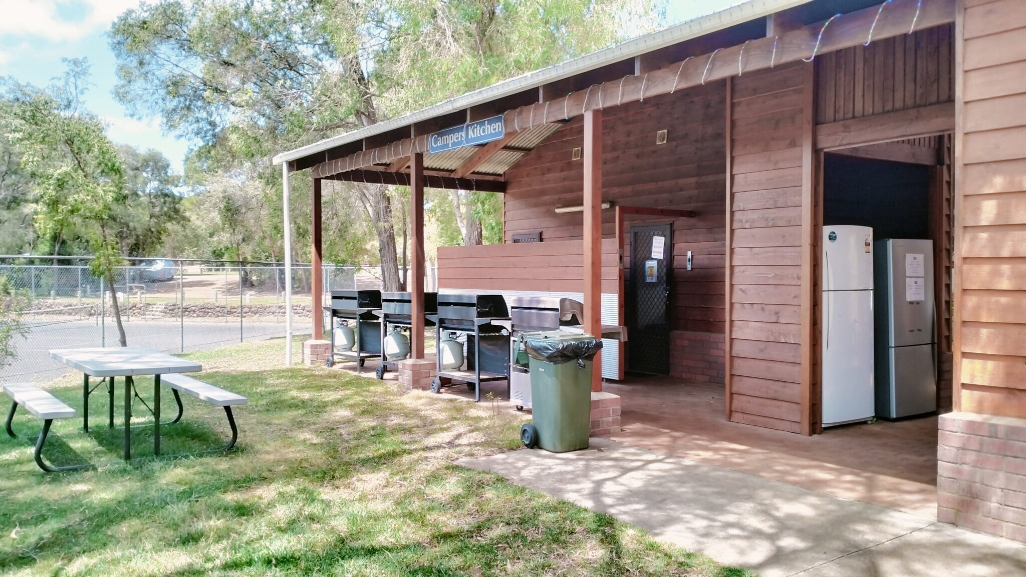 - Camp Kitchen: Our camp kitchen is fully equipped with all your camping needs – tables/chairs, free gas BBQ’s, electric hotplate, microwaves, kettles, toasters, large sinks with tea towels, cloths/scourer and dish soap refreshed daily.